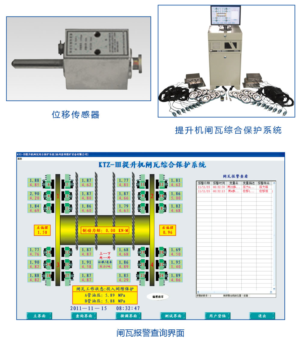 提升機(jī)制動(dòng)器閘間隙報(bào)警裝置,通過(guò)接觸式閘間隙傳感器、貼閘壓力傳感器、電磁換向閥動(dòng)作傳感器和油壓傳感器, 對(duì)制動(dòng)裝置運(yùn)行參數(shù)例如閘間隙、 貼閘壓力、碟形彈簧曲線、油壓等進(jìn)行實(shí)時(shí)在線監(jiān)測(cè)、數(shù)字化顯示,設(shè)置了電磁換向閥憋卡、閘間隙超限等故障預(yù)測(cè)和報(bào)警功能,若監(jiān)測(cè)到使安全緊急制動(dòng)失靈的信號(hào),如電磁閥換向閥卡死無(wú)法泄油制動(dòng)等, 直接參與控制,自動(dòng)打開緊急回路泄油制動(dòng),避免事故發(fā)生。